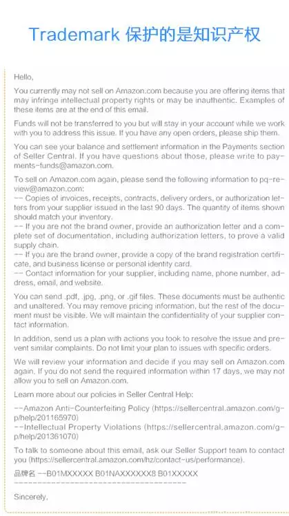 我紅 {MOD}線條框出來的部分大家細看。現(xiàn)在的侵權郵件大部分都是這種,會告訴你具體侵權的ASIN,侵權的類型和投訴的亞馬遜受理ID。