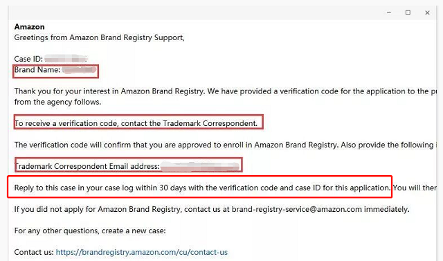 第8步:提交之后,亞馬遜會發(fā)一封品牌備案的郵件,需要在30天內(nèi)回復(fù)驗證碼(如果你的商標(biāo)是找服務(wù)商注冊的,就直接找注冊的服務(wù)商索?。?;