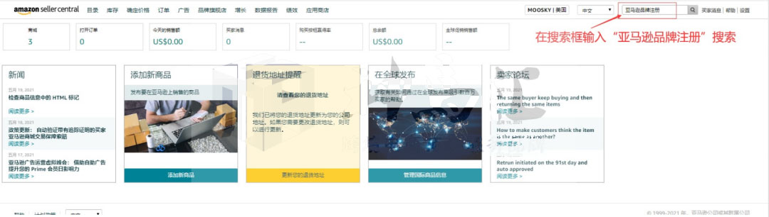 1.登錄自己要備案的店鋪, 在右上角搜索框輸入“亞馬遜品牌注冊”進行搜索