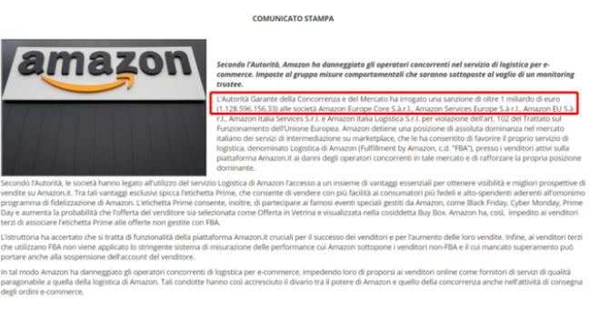 其實(shí)意大利官方反壟斷調(diào)查機(jī)構(gòu)早在2019年就開始對亞馬遜物聯(lián)網(wǎng)平臺進(jìn)行調(diào)查,在連續(xù)幾年的跟蹤中發(fā)現(xiàn),亞馬遜互聯(lián)網(wǎng)平臺私自利用其在自由競爭市場的便利,通過給選擇自己物流的商家隱形福利,來拓寬旗下公司物流業(yè)務(wù),很大程度上限制了其他物流公司和平競爭的機(jī)會,嚴(yán)重的違反了意大利的反壟斷法。