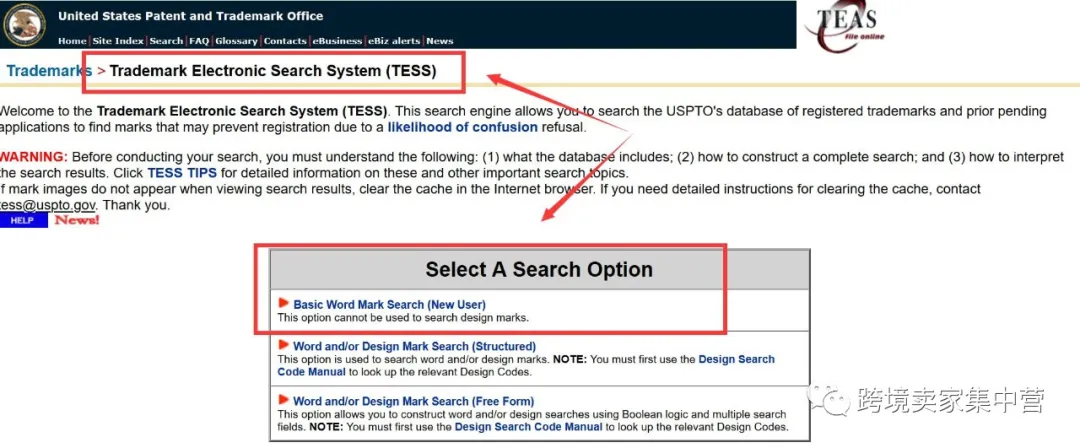 首先,打開美國商標(biāo)局的官網(wǎng),選擇‘Trademark Electronic Search System (TESS)’。