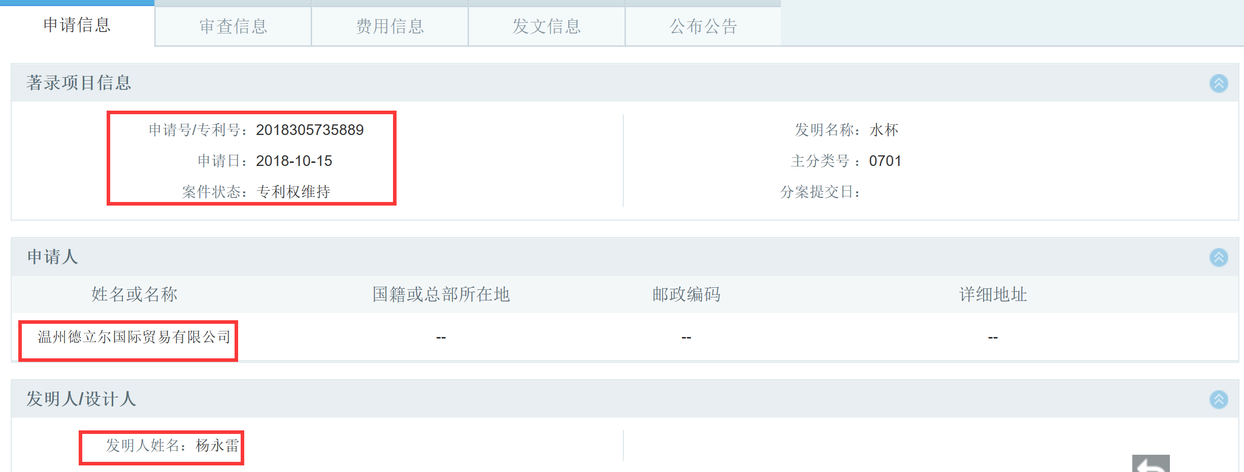 5、如點(diǎn)擊查詢申請信息,彈出的頁面中可查看到著錄項(xiàng)目信息、申請人、發(fā)明人等信息。