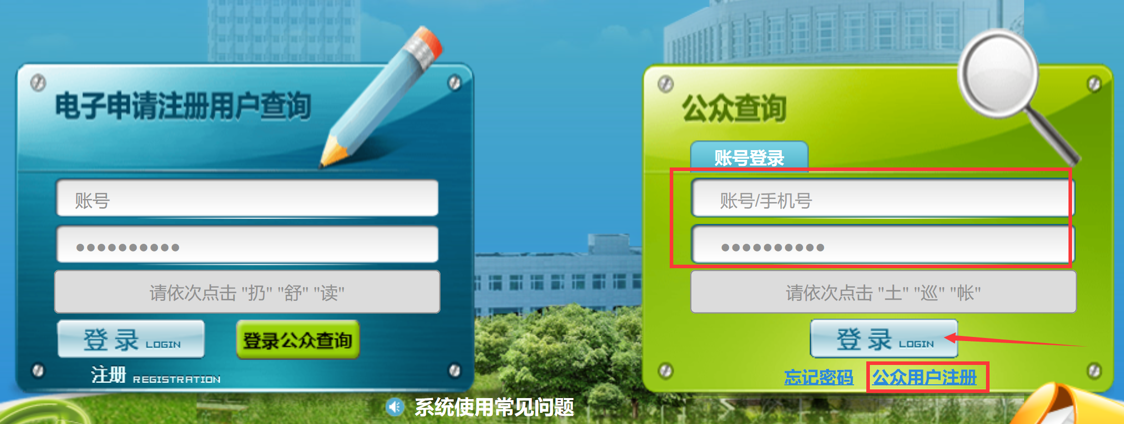 2、進(jìn)入后,通過右邊的公眾查詢框進(jìn)行查詢。首先輸入賬號和密碼進(jìn)行登錄,若是首次查詢,可通過“公眾用戶注冊”按提示注冊一個賬戶后,再進(jìn)行登錄。