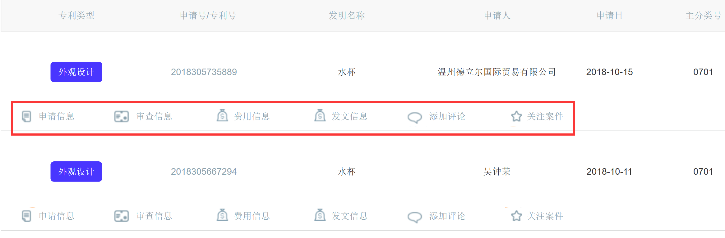 4、在查詢結(jié)果中找到你想查詢的那個外觀設(shè)計(jì)專利,點(diǎn)擊該外觀設(shè)計(jì)專利下方的各個選項(xiàng),便可以查詢該外觀設(shè)計(jì)專利的各種信息。