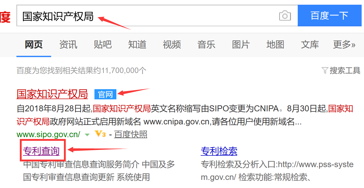 1、打開電腦,打開瀏覽器,在瀏覽器中搜索“國家知識產(chǎn)權(quán)局”,在搜索結(jié)果中找到“國家知識產(chǎn)權(quán)局官網(wǎng)”,在官網(wǎng)的下方功能欄選擇“專利查詢”,點(diǎn)擊進(jìn)入。