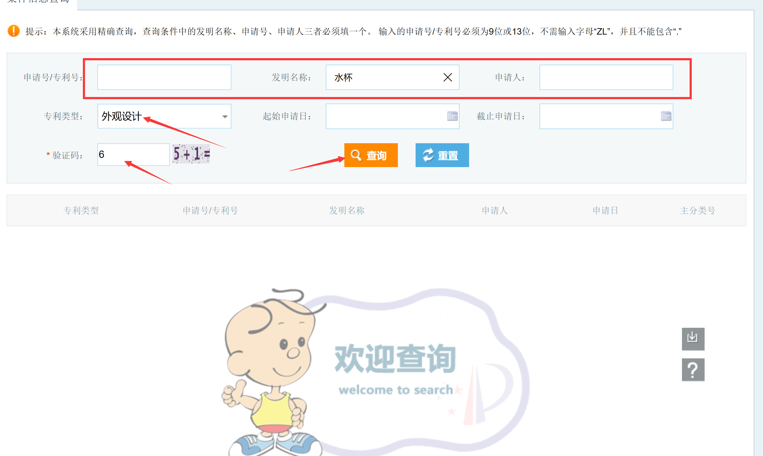 3、進(jìn)入信息查詢界面,在此界面中,可通過輸入申請?zhí)?專利號、發(fā)明名稱或申請人進(jìn)行查詢。以搜索發(fā)明名稱為例進(jìn)行查詢,在發(fā)明名稱一欄輸入“水杯”,專利類型選擇“外觀設(shè)計(jì)”,輸入驗(yàn)證碼,點(diǎn)擊“查詢”。