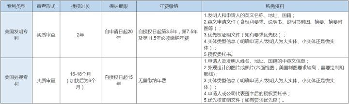 美國專利審查形式、授權(quán)時長、保護(hù)期限及申請所需資料等詳見下表: