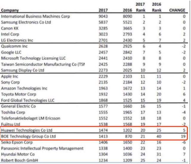 中國有兩個(gè)公司上榜,分別是華為和京東方。